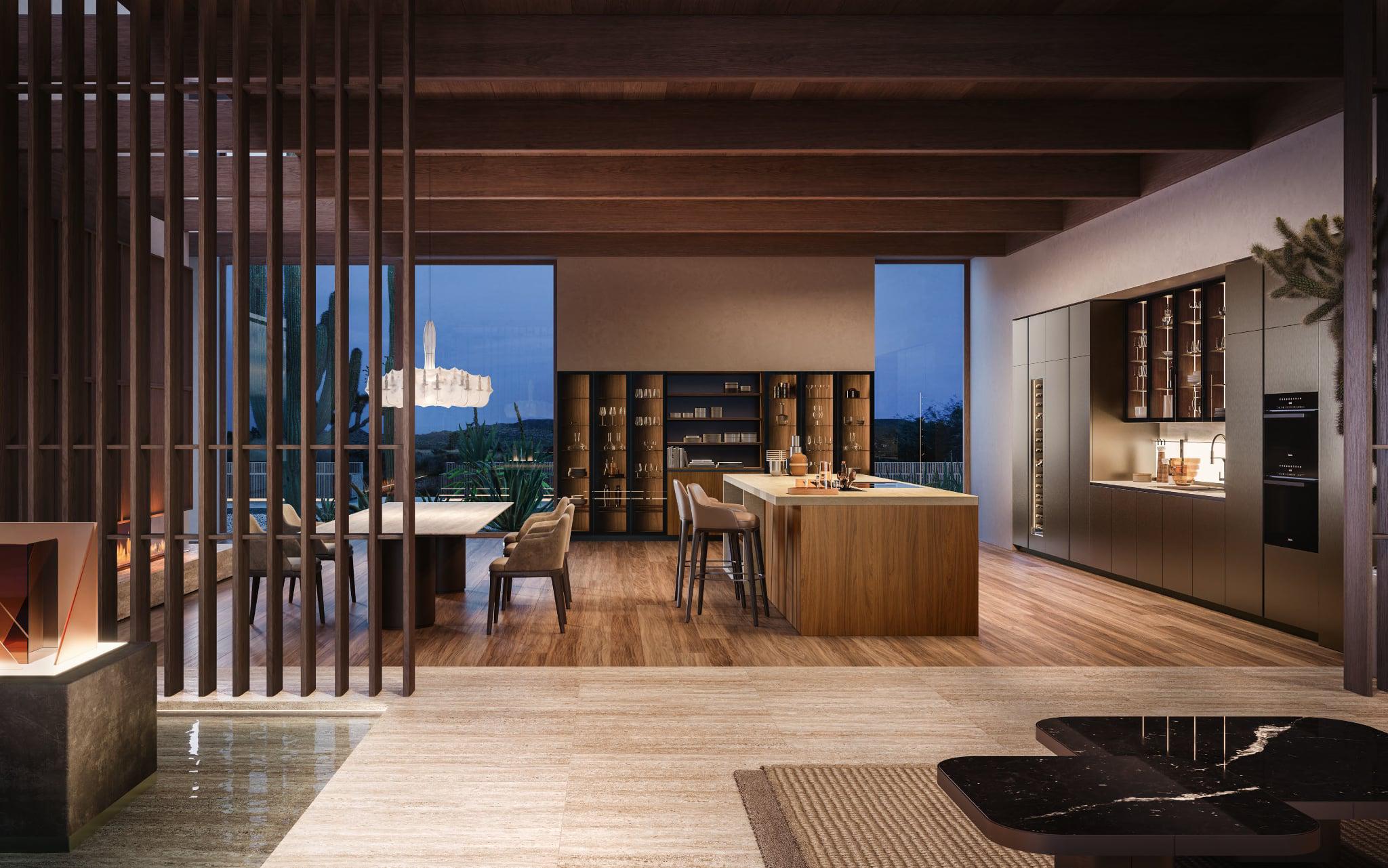 – Cuisines contemporaines mêlant bois et métal, avec plans de travail élégants et éclairage LED intégré.