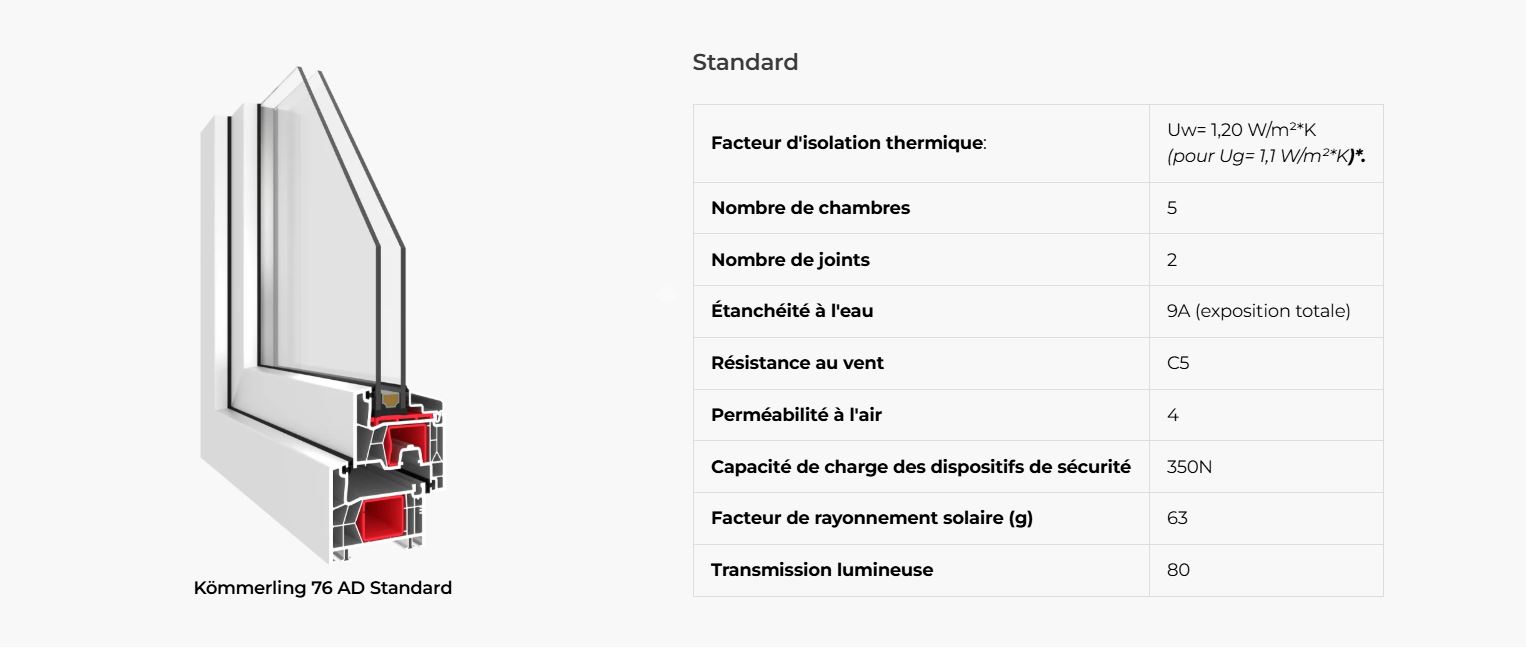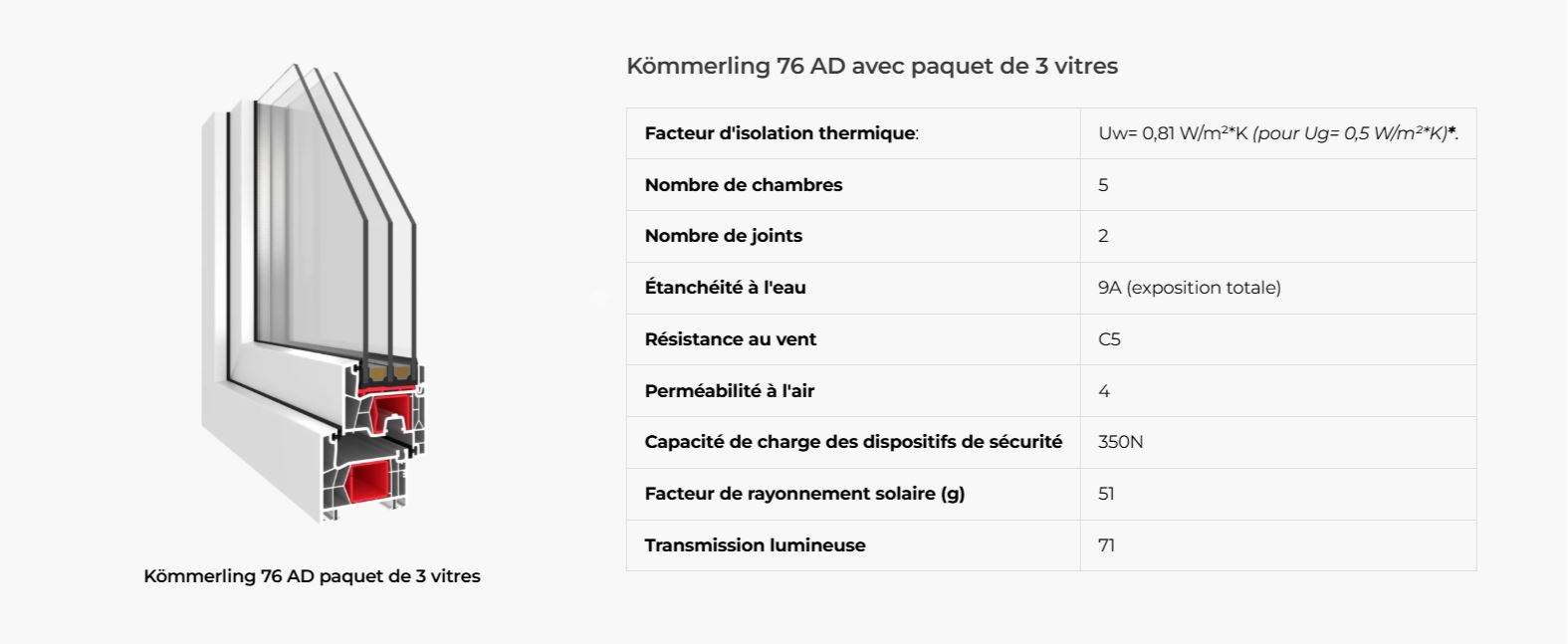 Le Kömmerling 76 AD est un système de portes et fenêtres PVC moderne conçu pour offrir un excellent compromis entre performance énergétique, confort acoustique et sécurité.