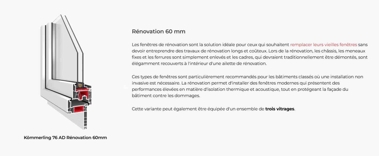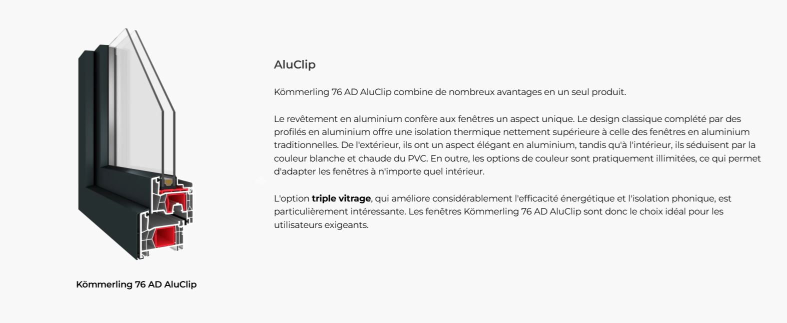 Le Kömmerling 76 AD Standard existe en version double vitrage, mais ce n’est pas la seule solution disponible. Ce système est également proposé dans les variantes AluClip et Renovation 60 mm, offrant une flexibilité maximale pour la rénovation et la construction neuve.
